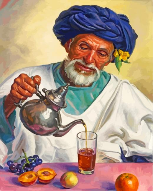 What’s In Old Moroccan Man Pouring Tea paint by numbers kit?